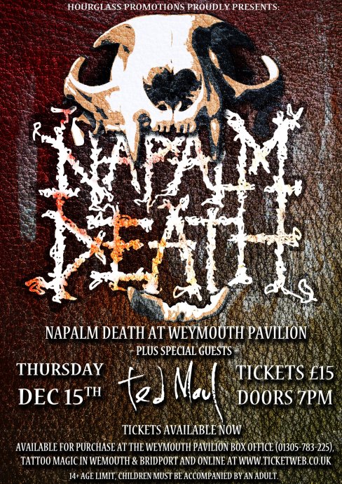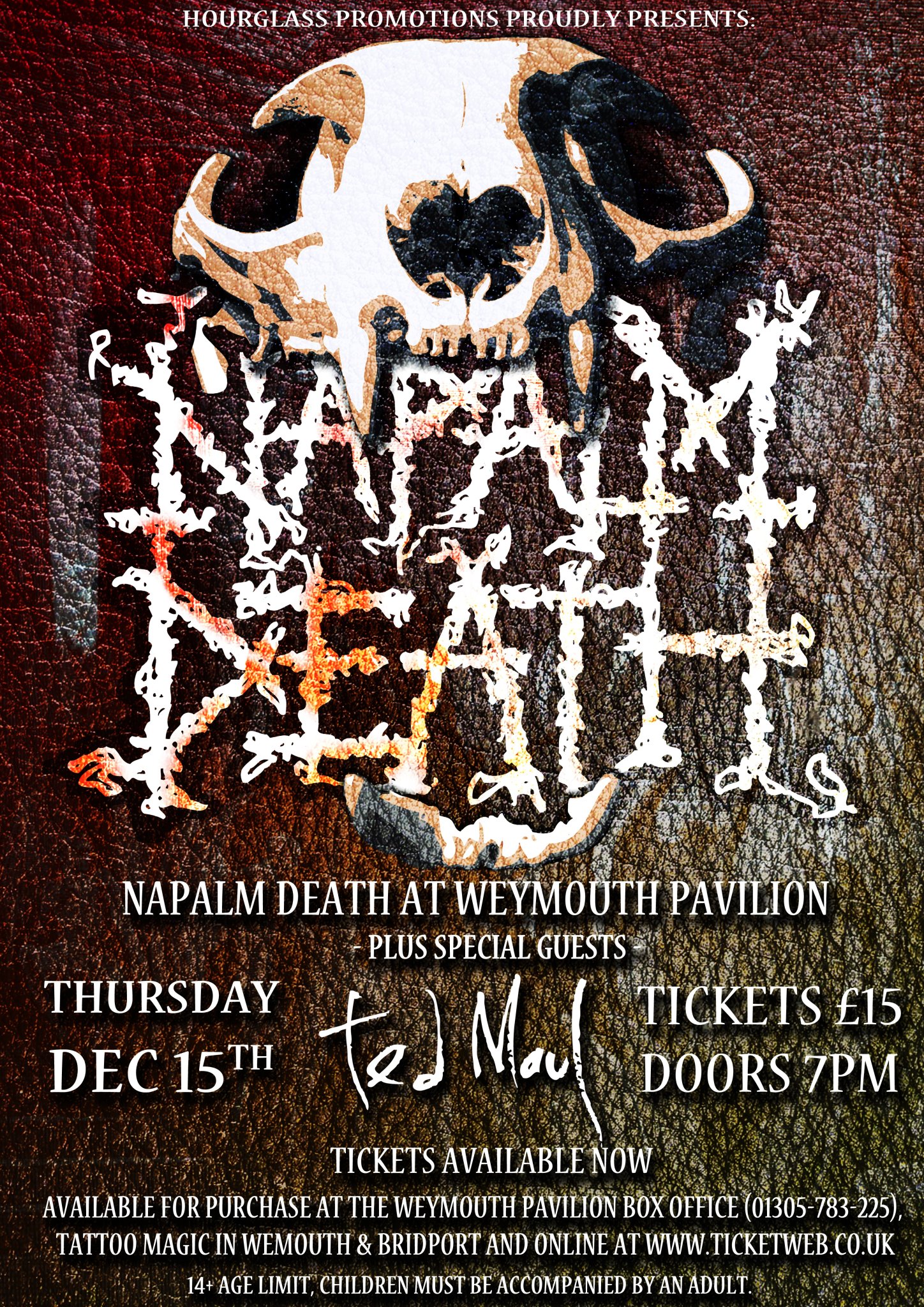 Two decades later, Dorset’s Hourglass Promotions have made it their mission to bring proper rock and metal music to the county, specifically Weymouth, a sleepy, old-fashioned seaside resort more used to putting on Canon and Ball and Jethro. In the past year Hourglass have already hosted legendary death metal bands Sepultura and Morbid Angel, and tonight saw the visit of one of Britain’s finest and longest-serving grindcore acts, Napalm Death.